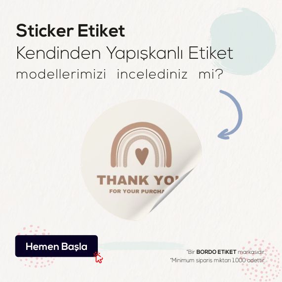Sticker Etiket ya da kendinden yapışkanlı etiketler ürünlerinizi paketleme yaptıktan sonra pellur kağıdı üzerine ya da ürün paket üzerine markanızı nazik bir şekilde sunum yapabileceğiniz etiketlerdir. Hemen sticker etiket modellerini incele...